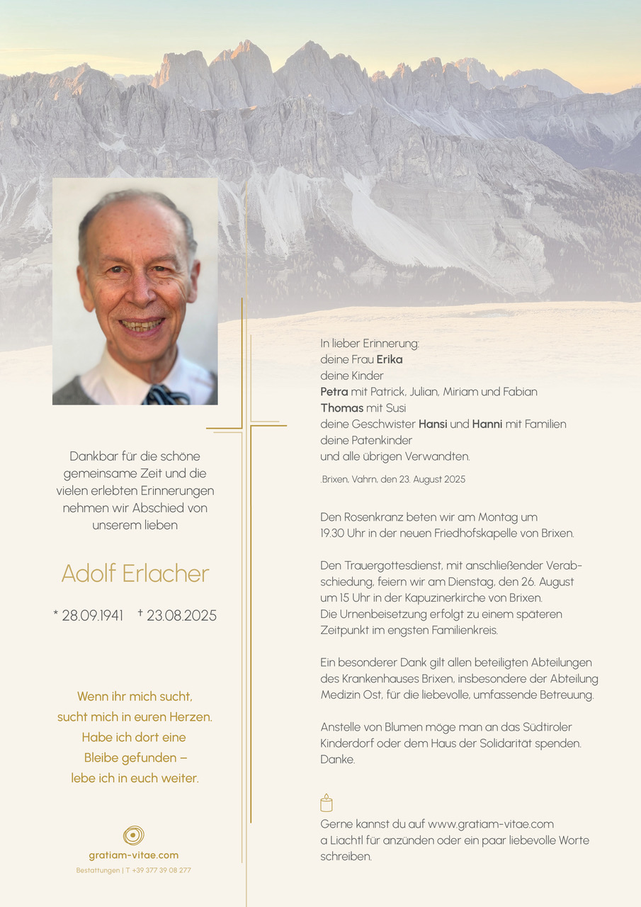 Lieber Adolf,eine unvergessliche Zeit der gemeinsamen Mitarbeit im Südtiroler Kinderdorf,Danke